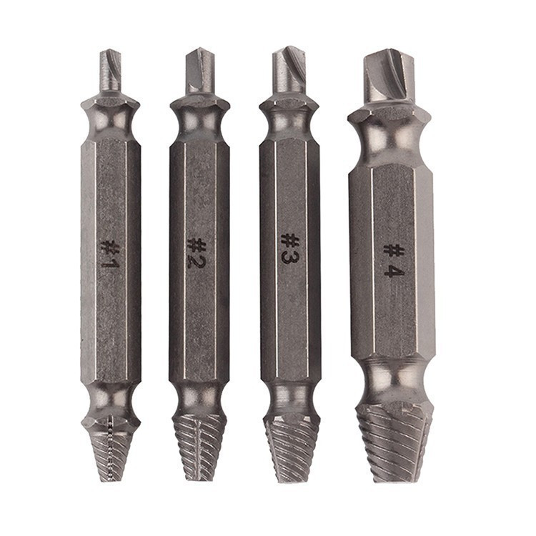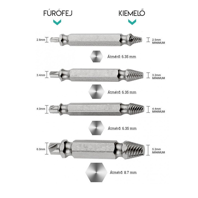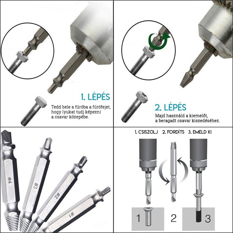 A tört csavar kiszedő segítségével akár kevesebb, mint fél perc alatt el tudod távolítani a legsérültebb csavarokat is. A készlet 4 darab csavarkiszedő szerszámból áll és szinte minden csavarozóval vagy fúrógéppel használhatóak. Bármilyen méretű és formájú csavarnál kiválóan alkalmazhatod. Csak meg kell fúrnod a sérült területet az eszköz fúró végével és a kiemelő végével egyenletesen kicsavarni.