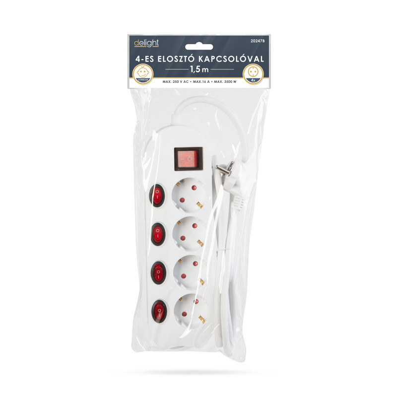 Delight 4-es elosztó - 4+1 kapcsolóval - 250 V • 16 A - 1,5 m
