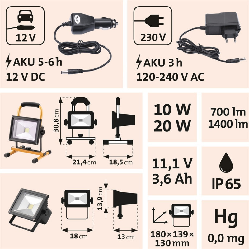 EXTOL LIGHT hordozható LED lámpa (reflektor), 10/20W; 1400 Lm, IP65, Li-ion akkus, 4400 mAh, tölthető: 230V és 12V is, 1,5kg