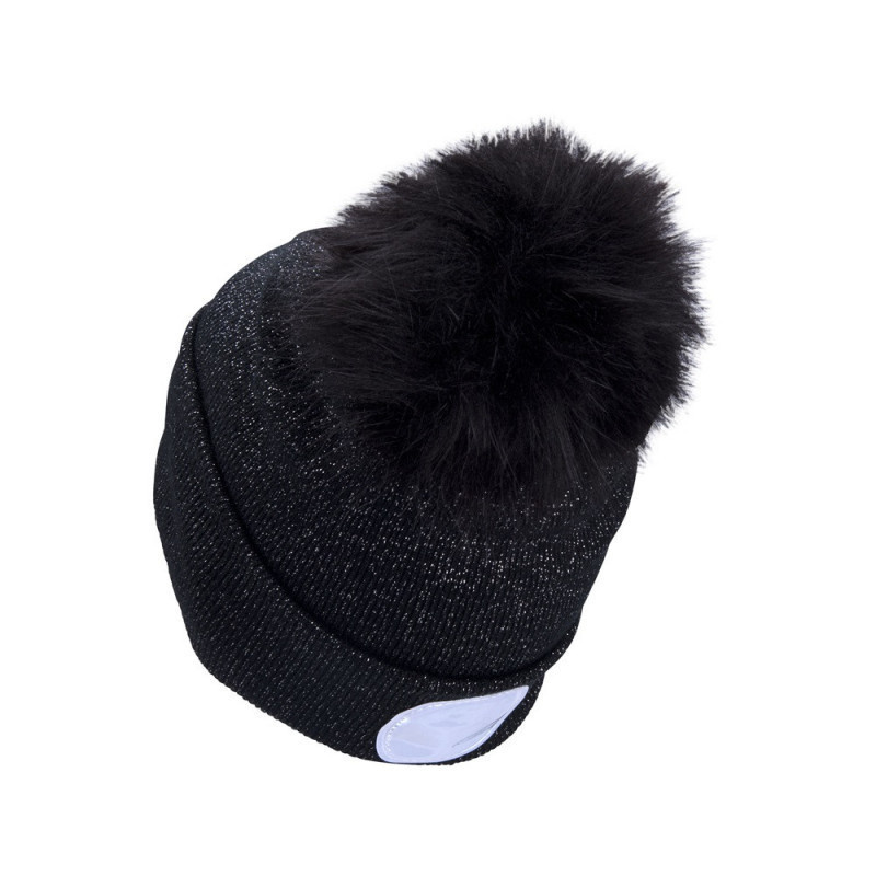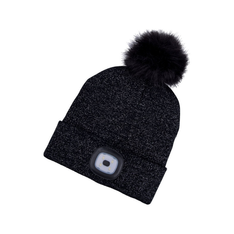 EXTOL LIGHT sapka, fekete, pomponnal, kötött, kivehető LED homloklámpával, 4×45 Lumen; USB tölthető Li-ion, 3funkció (100%-75%-5