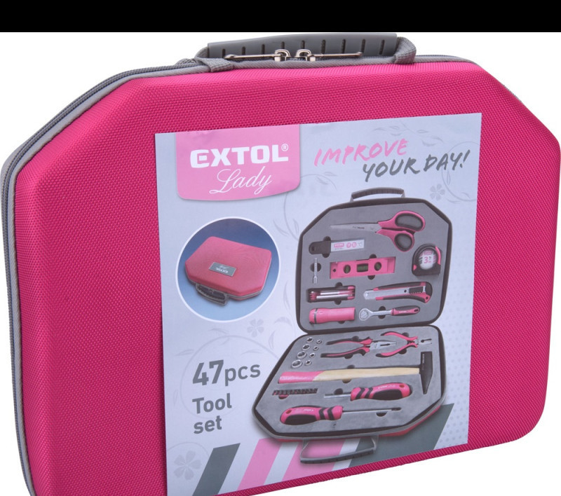 Fedezze fel az Extol Lady Szerszámkészletet, mely 47 darabból áll és tökéletes társ minden női műhelyben. Az Extol Lady készlet rózsaszín színével és stílusos megjelenésével igazán lenyűgözővé teszi a szerszámai gyűjteményét.