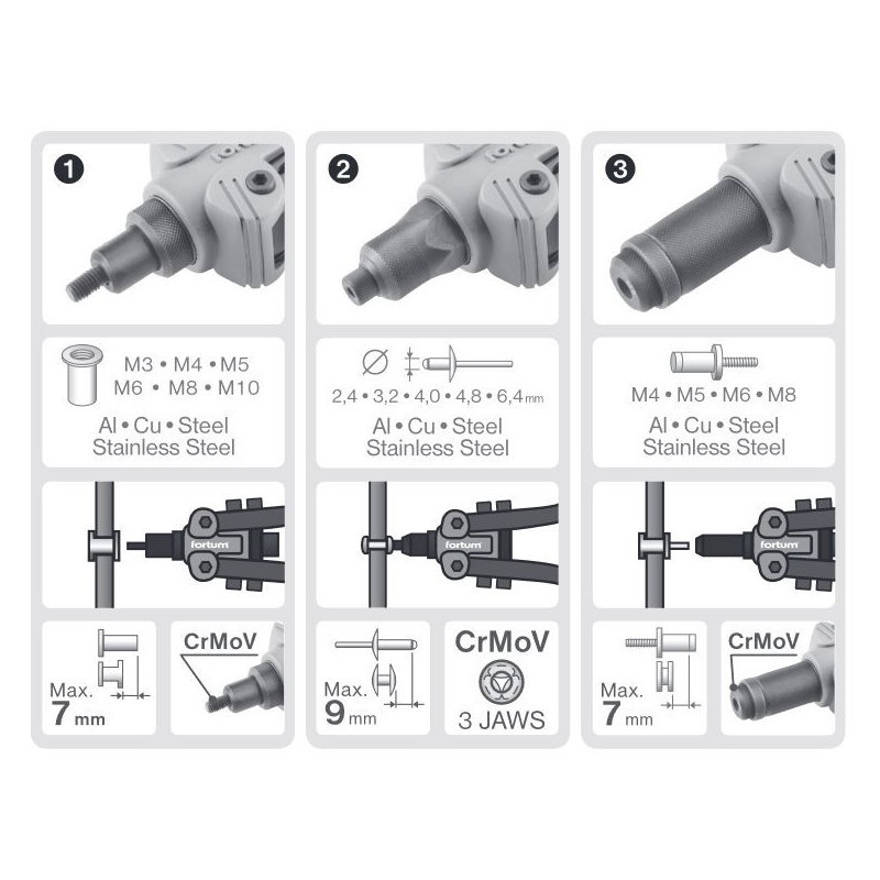FORTUM szegecsanya-, szegecscsavar- és popszegecs húzó fogó, 3az1ben, kétkaros; 325mm, CrVMo fej, FORTUM