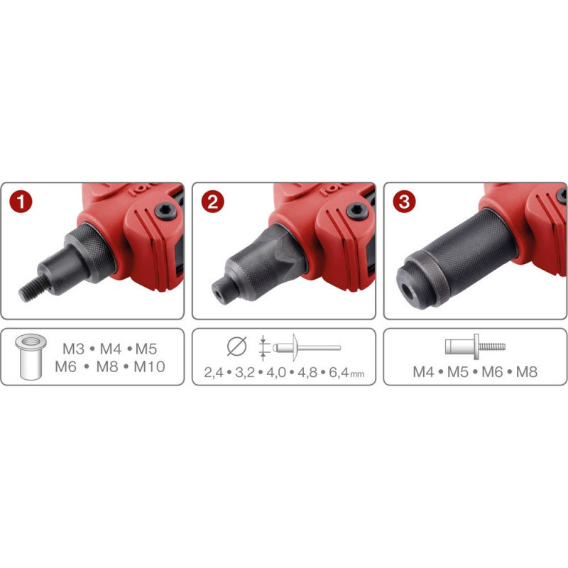 3-az1-ben funkció: szegecsanya húzó + szegecscsavar húzó + popszegecs húzó fogó is egy termékben! 1. Szegecsanya húzó Szegecsanya használatával megbízható, tartós, teherbíró anyamenetet hozhatunk létre vékony lemezekben, illetve zártszelvényekben és hasonló egyoldali hozzáférésű helyeken. A szegecsanyát a megfelelően előkészített furatba helyezzük, szegecsanya húzó szerszámmal meghúzzuk, minek hatására a szegecsanya teste megroppan a behúzással ellentétes lemezoldalon, a szegecsanya pedig stabilan a hordozójába rögzül. Előnyei: Egyoldali hozzáférés esetén is használható Teherbíró menetes anya vékony lemezben Gyors szerelhetőség Nem roncsolja a felületet Nem deformálja a munkadarabot Használható szegecsanya: Nyitott Anyagminőségek: M3,M4,M5,M6,M8,M10: ALU és réz M3 - M6-ig: acél és INOX cikkszám: 4770681 A behúzható szegecsanya számos iparágban és felhasználási területen alkalmazható, mint élelmiszeripar, gyógyszeripar, vegyipar, elektronikai berendezések, orvosi berendezések, telekommunikáció, fémbútorok, autógyártás, hajók, repülőgépek, tömegközlekedési járművek, világítótestek, erőművekben. 2. Szegecscsavar húzó Szegecscsavar használatával megbízható, tartós, teherbíró menetes csavart hozhatunk létre vékony lemezekben, illetve zártszelvényekben és hasonló egyoldali hozzáférésű helyeken. Előnyei: Egyoldali hozzáférés esetén is használható Teherbíró menetes csavar vékony lemezben Gyors szerelhetőség Nem roncsolja a felületet Nem deformálja a munkadarabot Használható szegecsanya: Anyagminőségek: M4,M5,M6,M8: acél, INOX, ALU és réz cikkszámok: 4770674, 4770675, 4770676 és 4770677 3. Popszegecs húzó A popszegecs néven ismerté vált húzószegecs általános típusai két vagy több lemezalkatrész összefogására alkalmasak. Megfelelő méretűre kiképzett furatokon átvezetett húzószegecs beszerelése popszegecs húzóval történik. Az tömegesen használt domború fejű és nyitott végű popszegecsek mellett több speciális tulajdonsággal bíró húzószegecs típussal is talákozhatunk. A szegecsek behúzás utáni viselkedését és szilárdsági tulajdonságait az anyagminőségen kívül a popszegecs kialakítása jelentősen befolyásolja. Eltérő típusok viselkedése más és más, ezért a szegecstípus kiválasztásakor mérlegelni kell, hogy az egyes tulajdonságoknak milyen mértékben kell megfelelnie. Használható popszegecs: 2,4-3,2-4,0-4,8-6,4 mm Műanyag kofferben