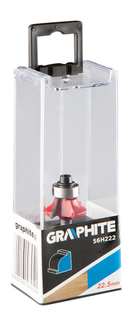 Formavágó, csapágyazott, lekerekítő marófej, HM, 22,5 x 9 mm, szár 6 mm GRAPHITE (cikkszám: 56H222). Fa, PVC, forgácslap pontos megmunkálására tervezve. A marófej szinterezett, keményfém lapkás vágóéllel rendelkezik. A marófejet csapágyazással látták el, amely megkönnyíti a marógép vezetését. A munkadarab méretei: átmérő 22,5 mm, magasság 9 mm; a szár átmérője 6 mm.