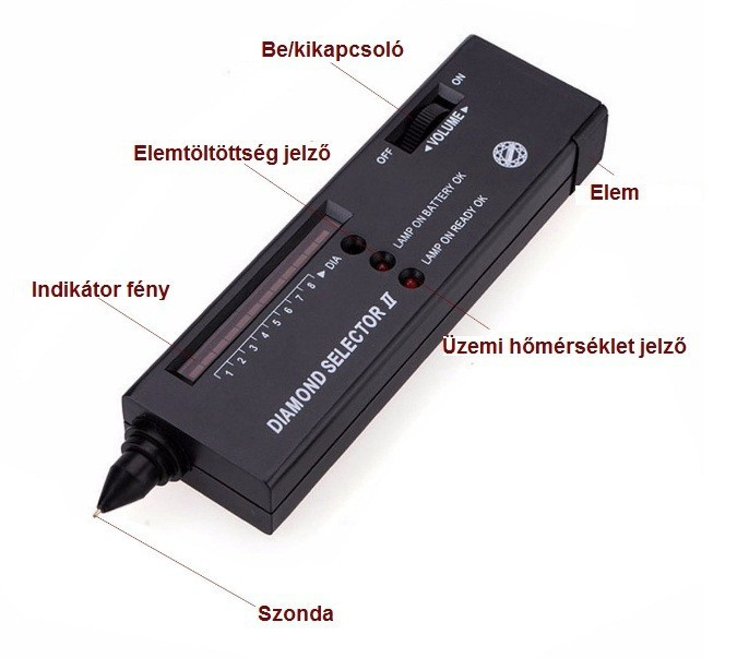 Használatához először kapcsold be a készüléket, majd várj fél percet, amíg felmelegszik. Miután kigyulladt a megfelelő hőmérsékletet jelző lámpa, a mérőeszköz fejét a gyémánthoz érintve meg is kezdheted a vizsgálatot.