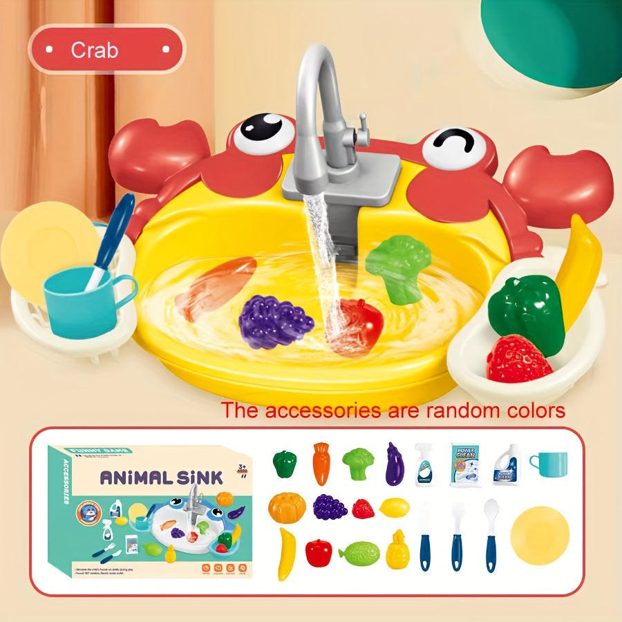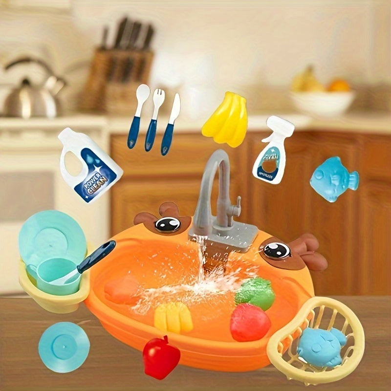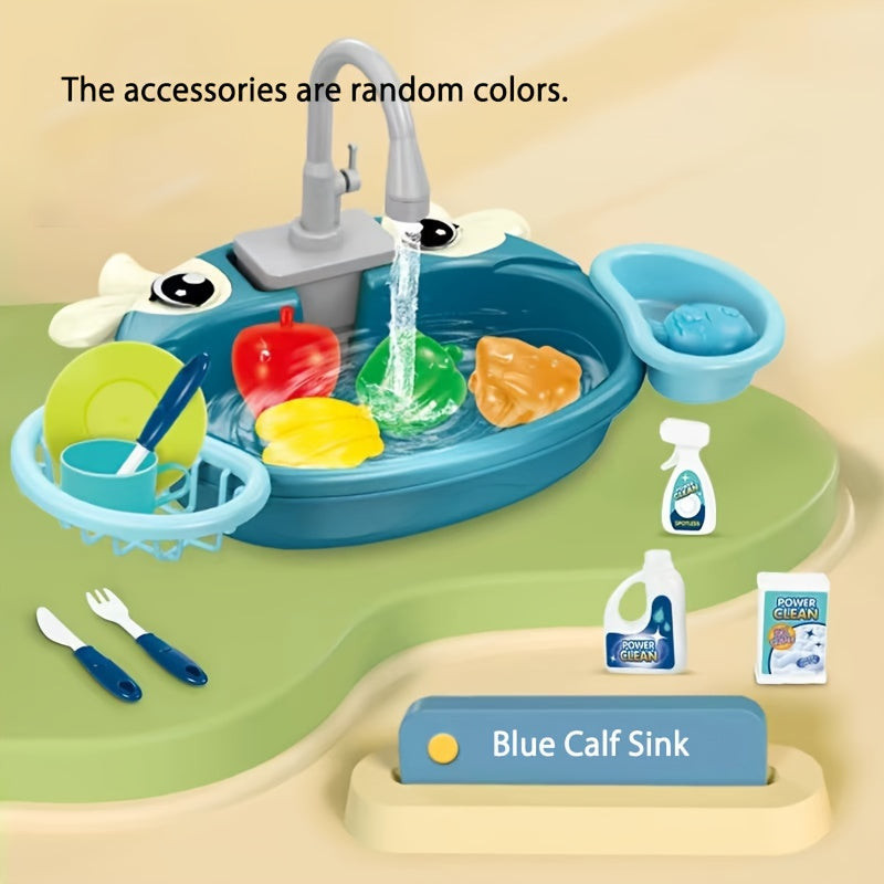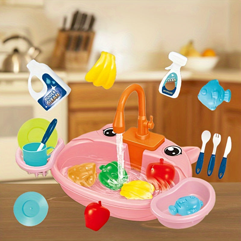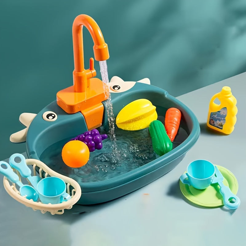Játék mosogatógép, csappal és evőeszközökkel, zöldség-gyümölcs játék készlettel