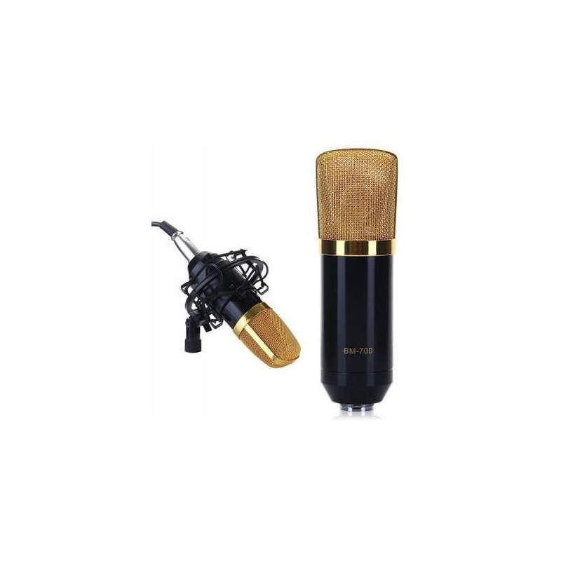 Klasszikus kondenzátor mikrofon podcast-hez, kiegészítőkkel, arany színű védőráccsal