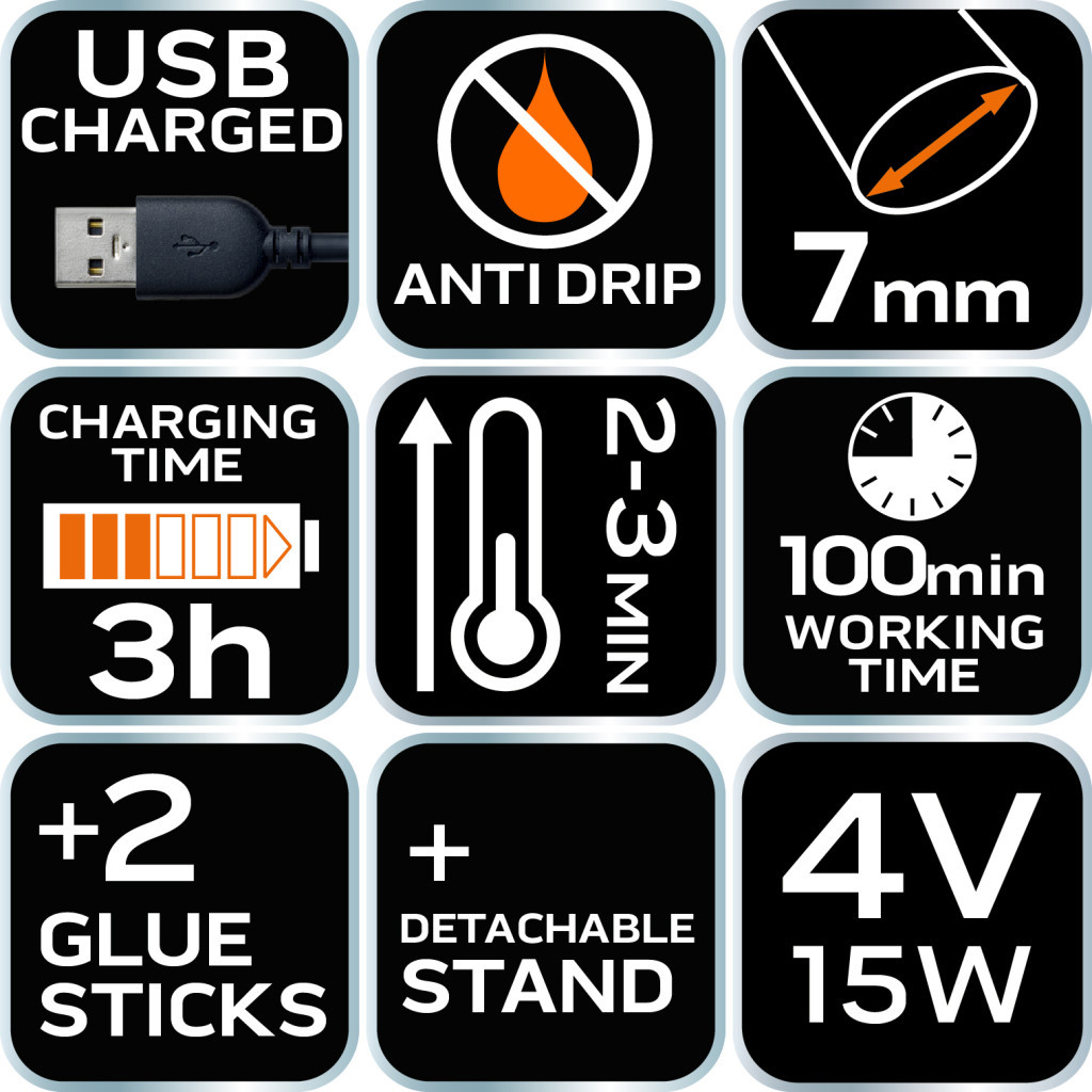NEO TOOLS Akkus ragasztópisztoly 8mm, 4V, USB tápegység 17-084