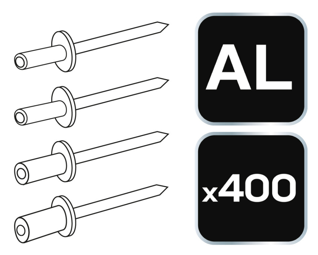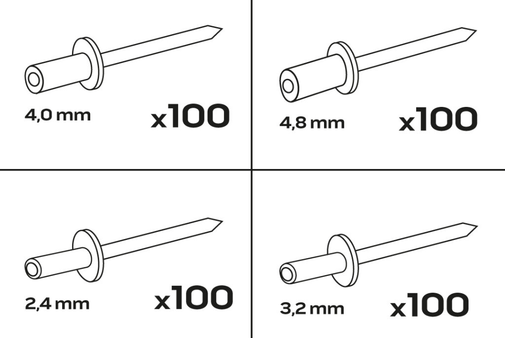 NEO alu popszegecskészlet, 400 db-os. Popszegecs készlet:, 100 x 2.4 мм, 100 x 3.2 мм, 100 x 4.0 мм, 100 x 4.8 мм