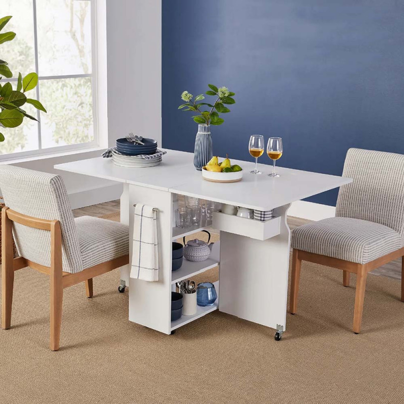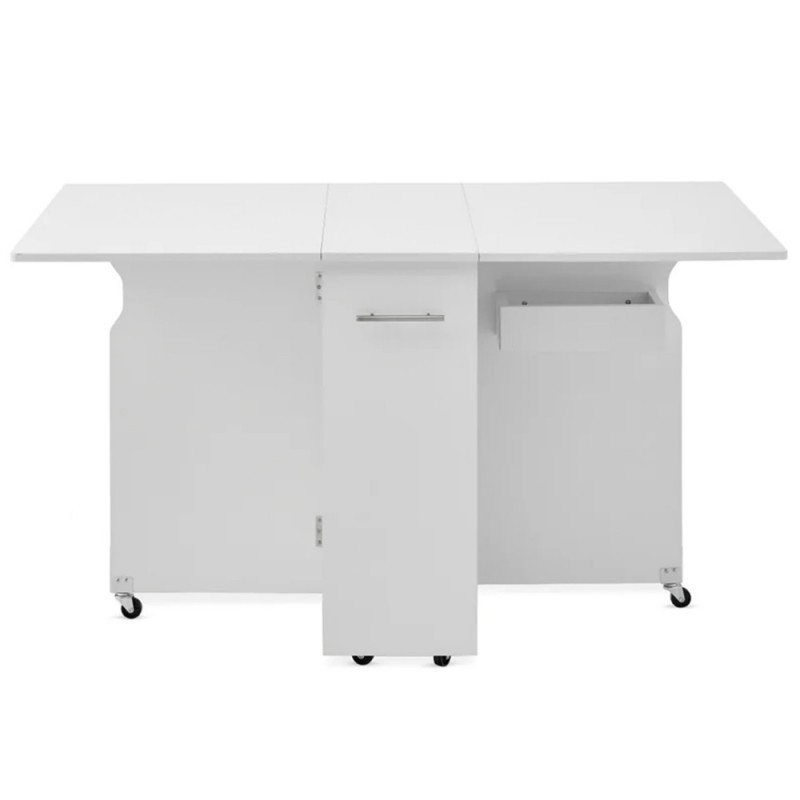 Összecsukható gurulós asztal polcokkal, kinyitható asztallappal, fehér