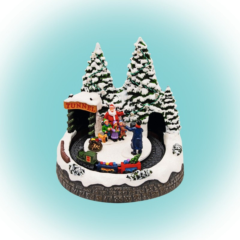 Világító karácsonyi életkép, fényképésszel, Mikulással, vonattal