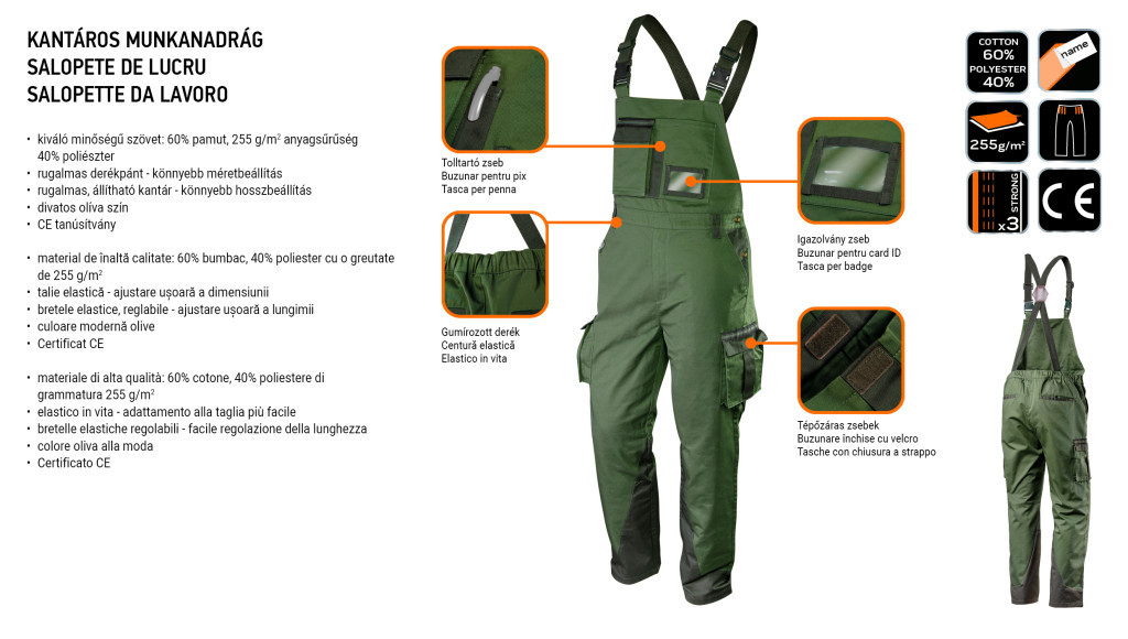 NEO oliva színű kantáros munkanadrág a CAMO termékcsalád része.Kiváló minőségű pamut-poliészter szövetből készül. A szabályozható nadrágtartó és a derék hátsó részén található gumi lehetővé teszi a nadrág hozzáigazítását a testalkathoz, egyidejűleg biztosítva a munka komfortját. A szolíd, nagy és tartós zsebek lehetővé teszik a szükséges eszközök tárolását. További zsebek vannak az azonosító kártya és a golyóstoll számára. A nadrágot kiemeli a kontrasztos betétekkel ellátott divatos olívazöld színe.A modern fazon lehető teszi a termék munka utáni viselését. A CE európai tanúsítványa garantálja minőségét. A NEO márka a professzionális igényeket is kielégíti. Munkanadrág,kantáros, olíva,Camo, S méret, 60% pamut, 40% poliészter, 255 g/m2, multifunkciós zsebek, tépőzáras zárható zsebek, zseb az ID-hez, tolltartó zseb, gumizott derék, hármas varrás, azonosító címke, CE tanusítvány